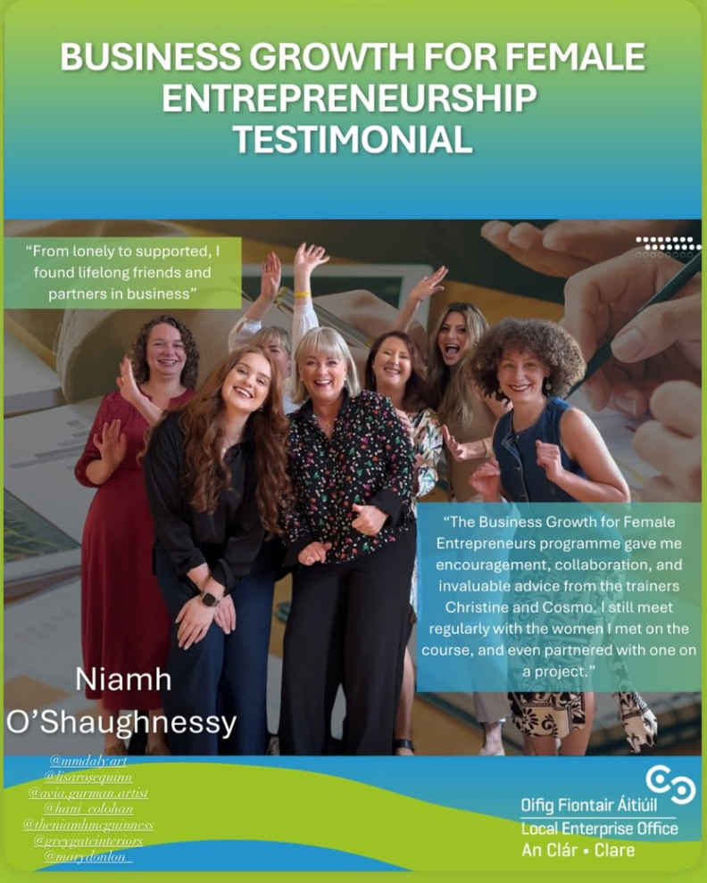 Partnerships with initiatives such as Enterprise Ireland’s women-in-business programmes, ACORNS rural networks, and local arts/community groups align closely with my vision: to build confidence, visibility, and creative sustainability for both women and men.